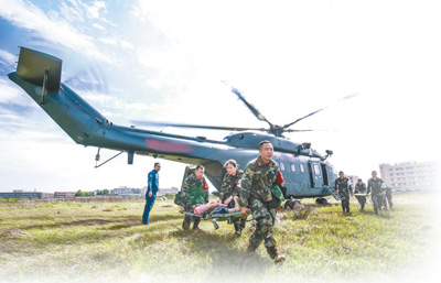 在第十一个全国防灾减灾日之际,武警某部在四川德阳组织所属机动、交通、直升机、工兵防化、医疗等力量,以应对突发性重(特)大地质灾害为背景,开展抢险救援演练。演练中该部利用直升机和救护车空地联合转运和救助“伤员”。图为5月8日,武警某部在抢险救援演练中借助直升机将“伤员”转至后方医院。