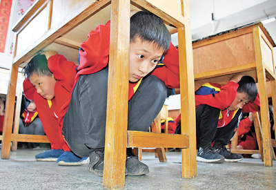 5月9日,邢台市新华南路小学举行防灾减灾教育活动,帮助学生树立良好的自我保护意识,增强避灾自救能力,迎接“防灾减灾日”。图为当日,该小学学生在防震演练中。