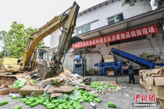 资料图:工作人员使用挖掘机销毁假冒伪劣食品药品。中新社记者 陈骥旻 摄