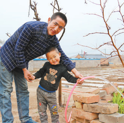 36岁的西吉县兴平乡团结村村民王五旦和儿子展示自来水。