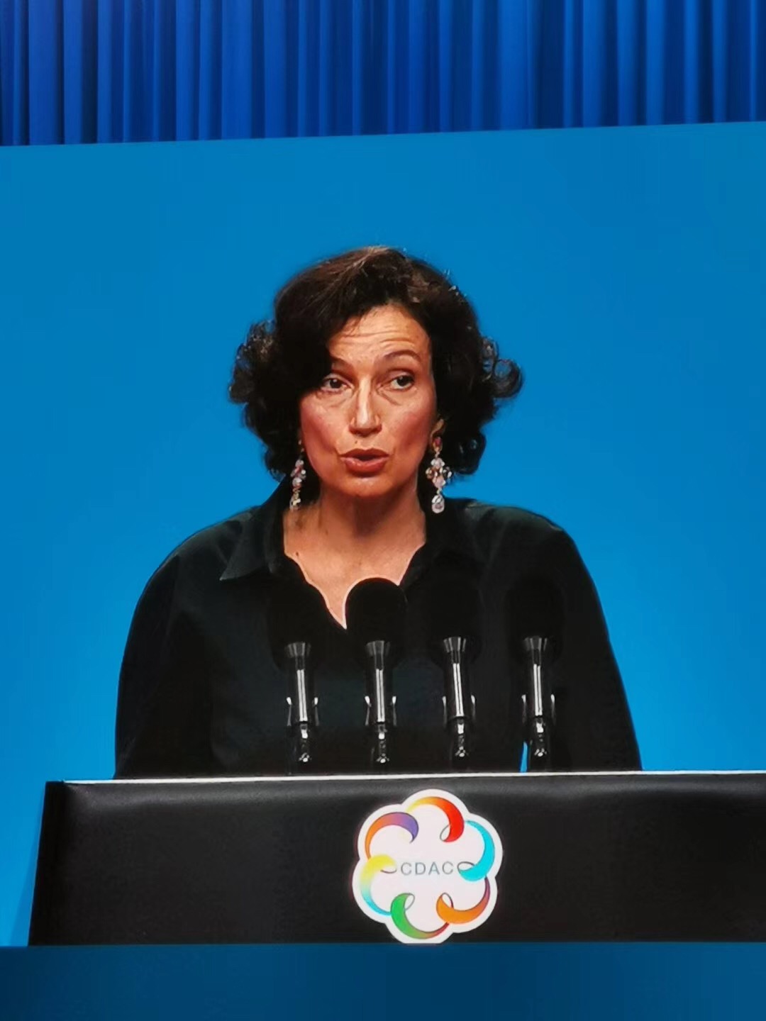 △当天,6位外方领导人在开幕式上致辞。联合国教科文组织总干事阿祖莱在致辞时,提到了2014年习主席在联合国教科文组织总部发表的那场著名演讲。她引用阿拉伯旅行家伊本·白图泰的一段话作为致辞的结尾:“旅行首先使人惊叹于他的所见所闻,然后使人成为历史的讲述者。我们共同分享我们的历史,我们在历史上结下了深厚的联系,又有共同的想象,使我们更加有韧性,使我们能够塑造和平。”