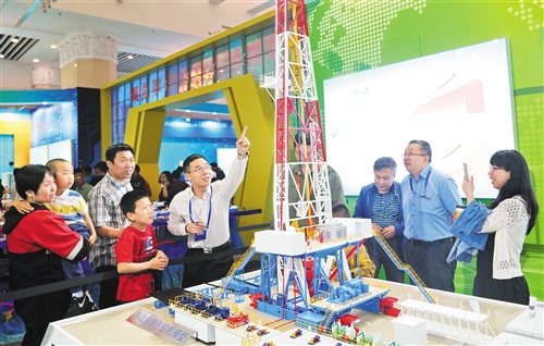 走进国家科技重大专项展区,两米多长的湛蓝色海洋深水油气勘探开发模拟展示台吸引了众人的目光,展示了由中国海洋石油集团研制的亚洲最先进12缆物探船、深水工程勘察船、可覆盖750米到3000米水深的深水半潜式钻井平台等一批高精尖装备模型。