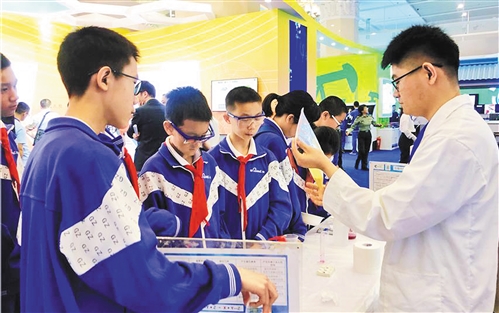 北京科技周主会场展厅里,趣味化学实验室的工作人员在给学生演示化学实验。 本报记者 郭静原摄