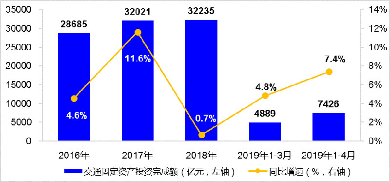 1-4月,交通固定资产投资完成7426亿元,同比增长7.4%,增速较一季度加快2.5个百分点。公路水路完成投资5533亿元,同比增长4.3%,其中高速公路完成投资2767亿元,同比增长13.2%,内河、沿海分别完成投资164亿元和151亿元,同比分别增长17.4%和14.6%。