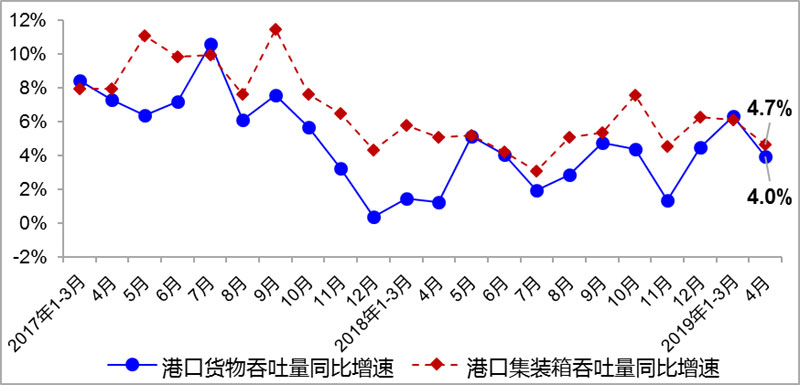4月,全国港口完成货物吞吐量11.5亿吨,同比增长4.0%,其中内、外贸吞吐量分别增长5.6%和0.8%;完成集装箱吞吐量2194万标箱,同比增长4.7%。