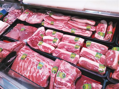 超市冰柜里出售的猪肉。