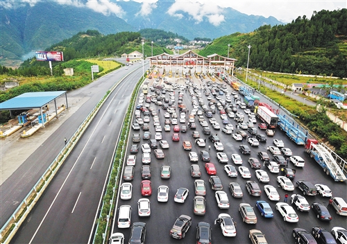 位于贵州省毕节市七星关区的厦蓉高速生机收费站前排起汽车长龙。(2018年10月1日拍摄) 何 欢摄(新华社发)