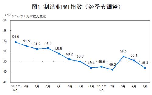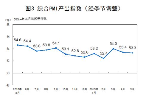 中新网5月31日电 据国家统计局网站消息,2019年5月份,中国制造业PMI为49.4%,比上月回落0.7个百分点,其中生产指数为51.7%,继续位于扩张区间;非制造业商务活动指数为54.3%,与上月持平,总体运行稳定,其中服务业商务活动指数为53.5%,比上月上升0.2个百分点;综合PMI产出指数为53.3%,比上月微落0.1个百分点,企业生产经营活动继续保持扩张。