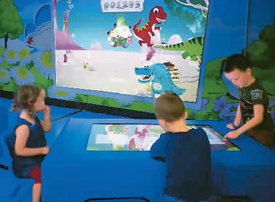 陆浩川团队的人机交互产品如今已销往全球20多个国家。图为儿童正在交互屏幕前玩得不亦乐乎。(受访者供图)