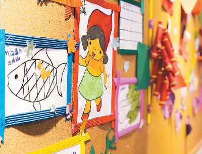 在北京五彩鹿高碑店校区的走廊墙壁上,张贴着自闭症谱系障碍儿童的绘画作品。画笔下藏着孩子心中五彩斑斓的世界。记者 孙亚慧摄