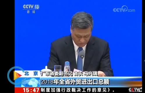 广东省委副书记 省长 马兴瑞:经济高速增长,GDP从1949年的20.3亿元增加到2018年的9.7万亿元,近30年位居全国前列,今年将突破十万亿元大关;对外开放不断扩大,2018年全省外贸进出口总额7.16万亿元人民币、约占全国四分之一、连续33年居全国首位。