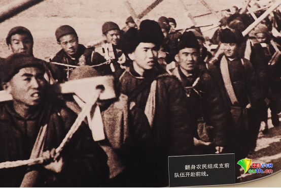 翻身农民组成支前队伍开赴前线。中国青年网记者 曾繁华 翻拍自西柏坡纪念馆
