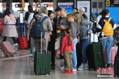 资料图为外籍游客在浦东国际机场T1航站楼向工作人员询问相关业务。 殷立勤 摄