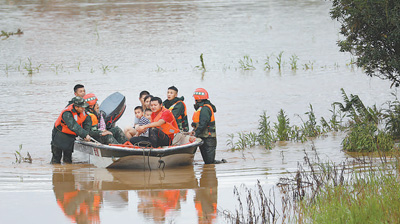 9日,在江西永新县在中乡排形村,救援人员转移受困儿童。