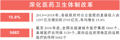 2019年,我国开展建立健全现代医院管理制度的试点。王贺胜介绍,选择高水平医院支持建设区域医疗中心,开展医药卫生体制综合改革,大胆地探索管理体制和运行机制的创新,提升中西部地区医疗服务水平。全面开展三级公立医院绩效考核工作,推动医院实现“三转变、三提高”,也就是在发展方式上从规模扩张型转向质量效益型,提高医疗质量;在管理模式上从粗放管理转向精细管理,提高效率;在投资方向上,从投资医院的发展建设转化为扩大分配,提高待遇。