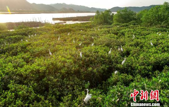 在广东江门台山镇海湾国家红树林湿地公园,众多鹭鸟栖息于红树林之上。 陈骥旻 摄