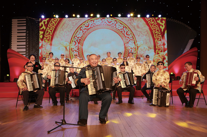 “北京榜样”任士荣,是新中国手风琴事业泰斗级人物,1996年退休后自告奋勇成为一名志愿者,无论年龄、职业,只要喜欢音乐,都可以免费跟他学琴。20多年来,他每周两次到社区免费授课。图为他教过的盲人学员在举办音乐会。 首都文明办供图