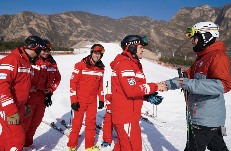 郎恩鸽是延庆海坨农民滑雪队队长,2018年度北京榜样。2017年7月11日,他带领18名高水平业余滑雪爱好者成立了志愿服务性质的海坨农民滑雪队,11名队员顺利通过培训考核,取得瑞士国家职业滑雪指导员证书,具备专业滑雪教练员资质。图为郎恩鸽向瑞士教练学习滑雪技术。 首都文明办供图
