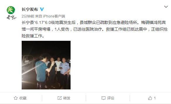 中新网6月18日电 据中国共产党长宁县委员会宣传部官方微博消息,长宁县“6.17”6.0级地震发生后,县城群众已疏散到应急避险场所。梅硐镇鸿苑宾馆一间平房垮塌,1人受伤,已送往医院治疗。救援工作组已抵达震中,正组织抢险救援工作。
