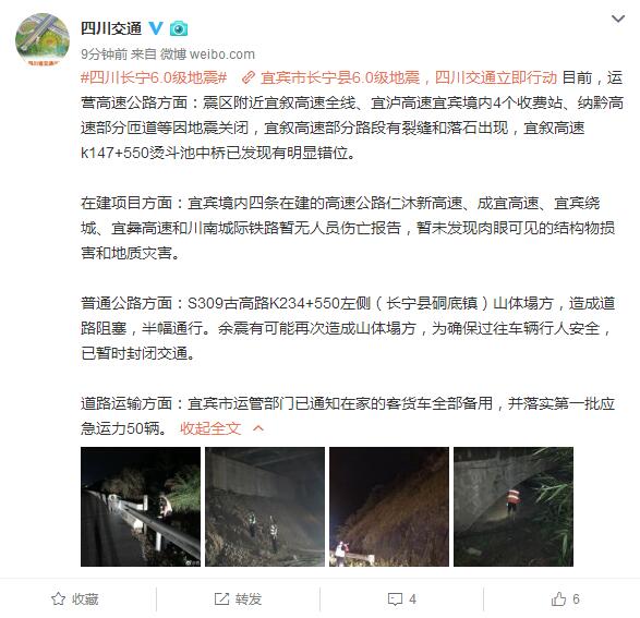 中新网6月18日电 据四川省交通运输厅官方微博消息,截至6月18日凌晨1时。运营高速公路方面:四川长宁6.0级地震震区附近宜叙高速全线、宜泸高速宜宾境内4个收费站、纳黔高速部分匝道等因地震关闭,宜叙高速部分路段有裂缝和落石出现,宜叙高速k147+550烫斗池中桥已发现有明显错位。