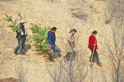 牛玉琴(右一)与儿子张立强(左二)和工人们一起到沙地里种树。