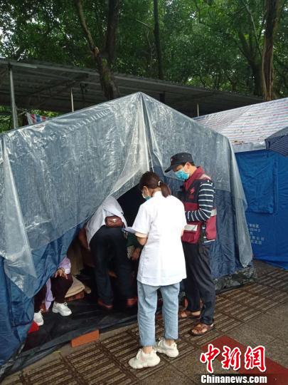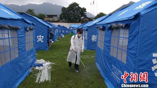 卫生防疫人员对安置点进行消毒。 钟欣 摄