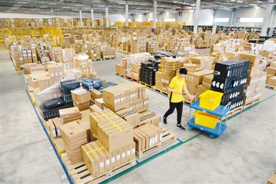 “6·18”电商大促前夕,江苏南京雨花物流基地内备货超2000万件,既有家电3C等,也有母婴、百货、生鲜等大快消商品。图为工人正在分拣商品。