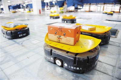 为处理购物节带来的大量快递订单,安徽省阜阳市颍东开发区的快递产业园中通快递阜阳分拣中心里,“小黄人”上阵分拣快件。