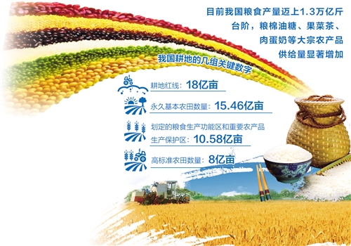 ——保护和提升耕地质量。耕地是农业生产的基础,关于我国耕地有几组数字:18亿亩,是耕地红线。15.46亿亩,是永久基本农田数量,要对其实施特殊保护制度,确保数量不减少、质量不下降。10.58亿亩,是划定的粮食生产功能区和重要农产品生产保护区,要实现上图入库、到村到户。8亿亩,是要建设的高标准农田数量,目前已建成6.4亿亩,耕地质量得以提升一至两个等级。同时还积极开展耕地保护与质量提升行动,促进耕地休养生息。