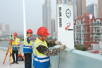 图为施工人员在立交桥上进行钢护栏油漆涂装。
