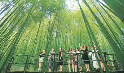 游客在山东省沂南县竹泉村的竹林中避暑纳凉。王彦冰摄(人民视觉)