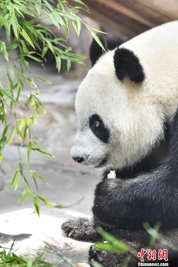 6月28日,广州长隆野生动物世界,“萌萌”在吃竹笋。中新社记者 陈骥旻 摄