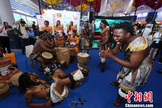来自乌干达的舞者在展厅内载歌载舞。 杨华峰 摄
