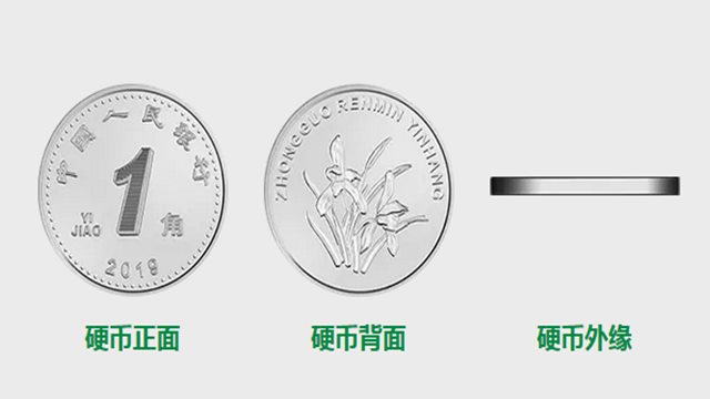 相比较1元和5角,新版1角硬币也发生了一些变化。2019年版第五套人民币1角硬币保持了2005年版第五套人民币1角硬币外形、直径、材质、外缘特征、“中国人民银行”行名、汉语拼音面额、人民币单位、花卉图案、汉语拼音行名等要素不变,调整了正面面额数字的造型,正面边部增加了圆点,也对背面花卉图案做了适当的收缩。