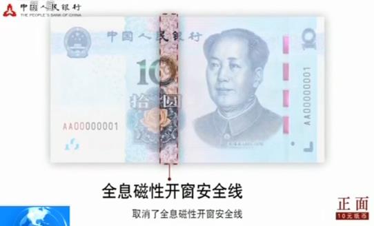 新版10元纸币正面中部面额数字,调整为光彩光变面额数字“10”,取消了全息磁性开窗安全线。