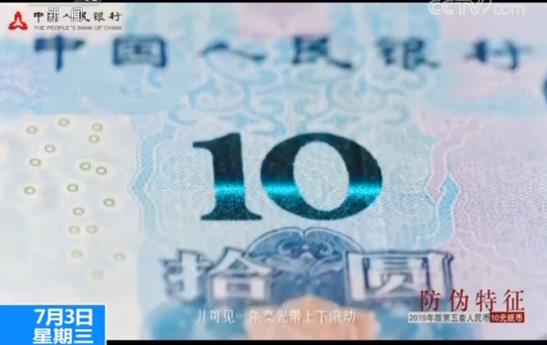 在防伪特征方面,光彩光变面额数字位于票面正面中部,改变钞票观察角度,面额数字“10”的颜色在绿色和蓝色之间变化,并可见一条亮光带上下滚动。