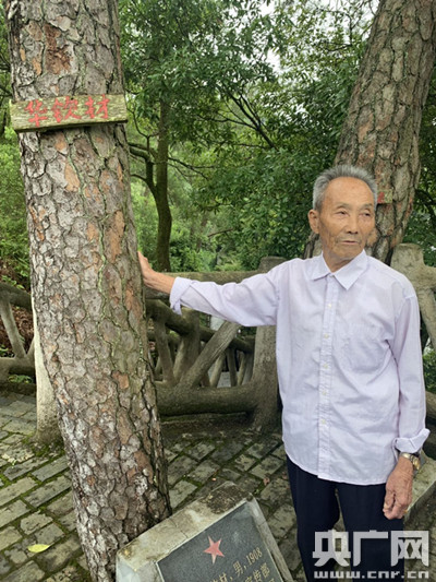 松树沿着路两边依次生长,树径已经超出了一个成年人的臂围。烈士华钦材的遗腹子华崇祈今年也83岁了,在后山修剪杂草时他常常会抚摸挂着父亲名字——“华钦材”的那棵松树,仿佛这样能离父亲近一些。“我爸爸是黄沙区的宣传部长,我叔叔是黄沙区的区主任,爸爸参军一个多月后我才出生。我爸爸二十多岁。很快就被杀掉了。”华崇祈说。