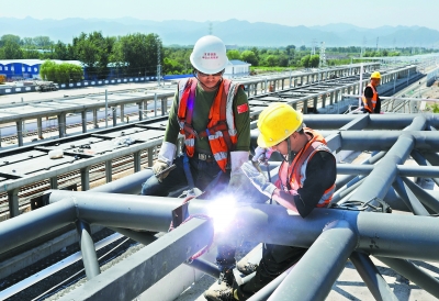 昨日午后,在建的京张高铁昌平站站房工程工地上,为保证工程进度,建设者们冒着高温奋战在一线,在距地面16米高的钢桁架上做着焊接、打磨工作。京张高铁是2022年北京冬奥会重要交通保障设施。记者 白继开摄