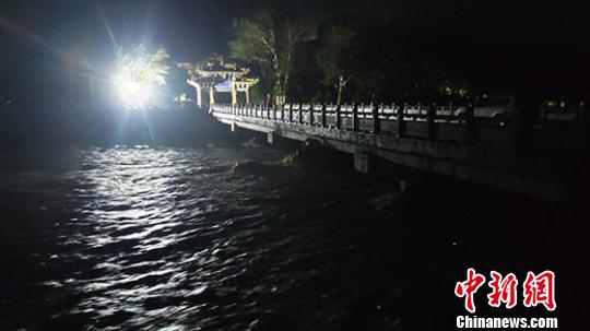 7月7日凌晨2时许,莫高窟窟区前的宕泉河洪峰穿过莫高窟1号桥。 敦煌研究院供图