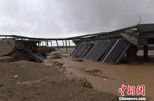 7月7日6时许,莫高窟旅游专线10公里处大桥北段桥头路基冲毁情况。 敦煌研究院供图
