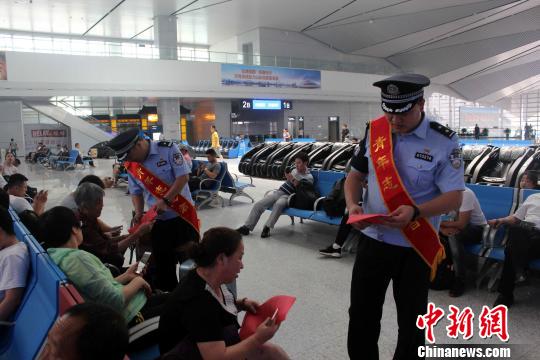全国铁路7月10日零时起实施新的列车运行图。青岛铁路公安处民警向旅客发放安全宣传资料。 梁西征 摄