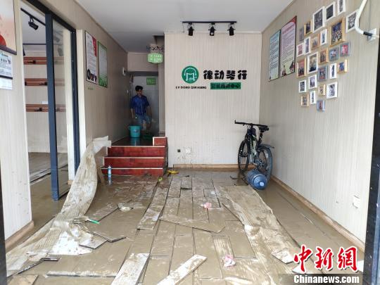 10日一大早,李建成就和员工来到琴行清理一楼被洪水泡坏的木地板。60多平方米的琴行一楼里,遍布被洪水冲来的各类垃圾,虽已冲洗数遍,但屋内的泥腥味仍未散去,洪水在墙壁上留下的水渍线足有1.2米高。
