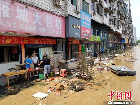 记者10日上午赶到步行街时看到,这里的洪水已逐渐退去,邵阳市城市管理行政执法支队已开始清淤;沿街商铺均不同程度受灾,商户在自发清理垃圾。