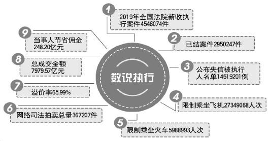 本报讯 记者张晨 实现基本解决执行难阶段性目标后,全国法院继续保持执行工作高水平运行,建立完善长效机制,着眼更高层次上推动执行工作长远发展,努力实现党的十八届四中全会提出的切实解决执行难目标。记者日前从最高人民法院执行局了解到,截至2019年7月9日,全国法院公布失信被执行人名单14519201例,限制乘坐飞机27349068人次,限制乘坐火车5988993人次。
