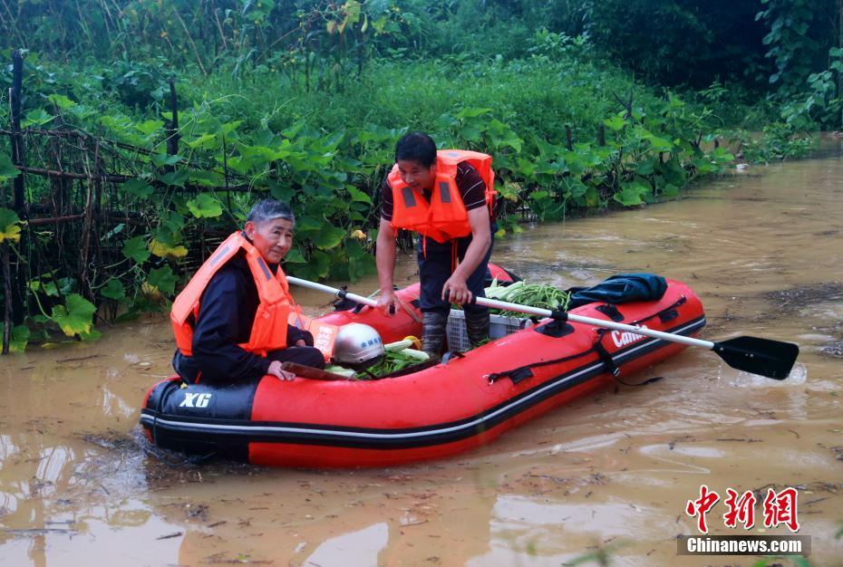 德兴市泗洲镇中洲村杨家湾,当地党委政府组织党员干部、抢险队员利用皮划艇对受灾群众进行救援。董世超 摄