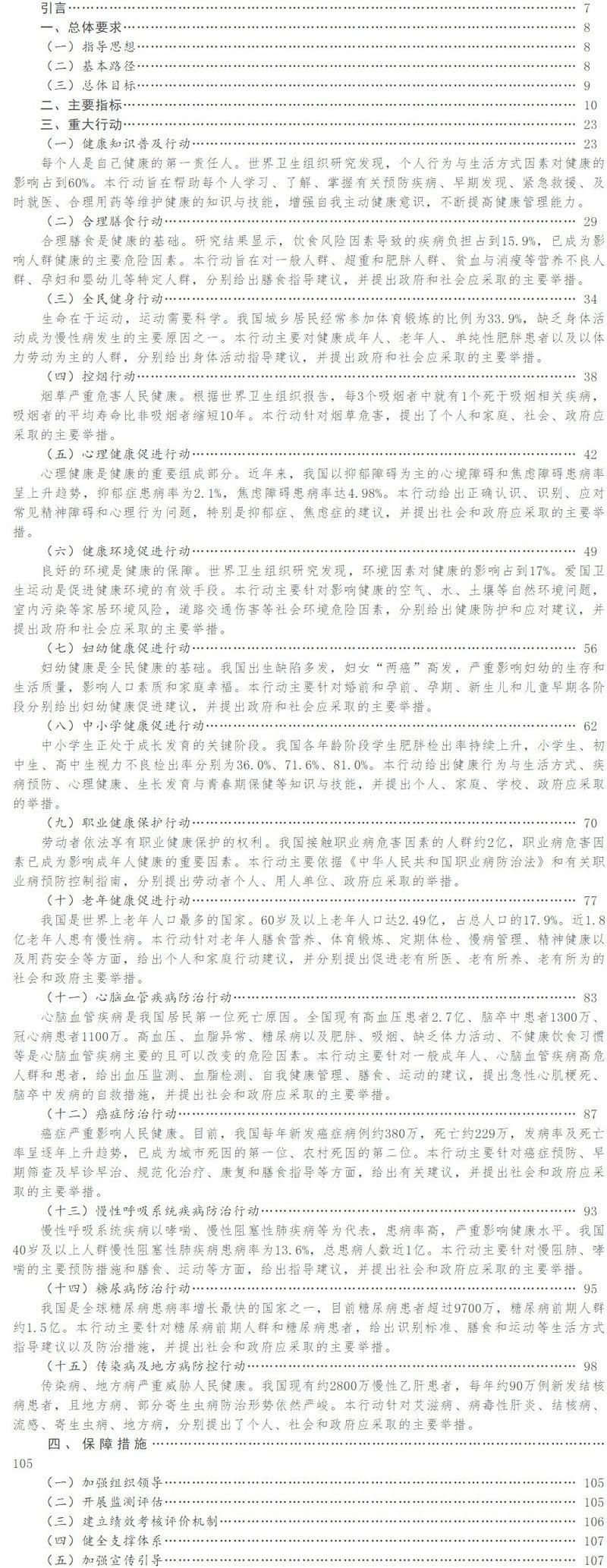 人民健康是民族昌盛和国家富强的重要标志。党的十八大以来,我国卫生健康事业取得新的显著成绩,医疗卫生服务水平大幅提高,居民主要健康指标总体优于中高收入国家平均水平。随着工业化、城镇化、人口老龄化发展及生态环境、生活行为方式变化,慢性非传染性疾病(以下简称慢性病)已成为居民的主要死亡原因和疾病负担。心脑血管疾病、癌症、慢性呼吸系统疾病、糖尿病等慢性病导致的负担占总疾病负担的70%以上,成为制约健康预期寿命提高的重要因素。同时,肝炎、结核病、艾滋病等重大传染病防控形势仍然严峻,精神卫生、职业健康、地方病等问题不容忽视,重大安全生产事故和交通事故时有发生。党的十九大作出了实施健康中国战略的重大决策部署,充分体现了对维护人民健康的坚定决心。为积极应对当前突出健康问题,必须关口前移,采取有效干预措施,努力使群众不生病、少生病,提高生活质量,延长健康寿命。这是以较低成本取得较高健康绩效的有效策略,是解决当前健康问题的现实途径,是落实健康中国战略的重要举措。为此,特制定《健康中国行动(2019—2030年)》(以下简称《健康中国行动》)。