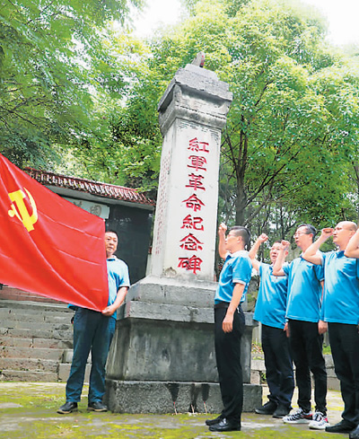 重庆在党员干部中广泛开展“不忘初心、牢记使命”主题教育活动。图为7月1日,重庆黔江排水公司党员在烈士陵园重温入党誓词。杨 敏摄(人民视觉)