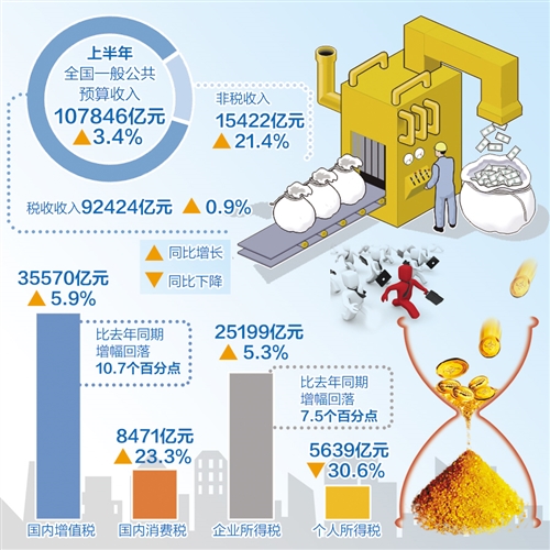 上半年,全国一般公共预算收入107846亿元,同比增长3.4%。其中,全国税收收入92424亿元,同比增长0.9%。