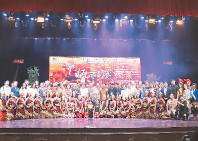 在观看《佤部落》演出后,演出人员同海外华文媒体代表一同合影留念。