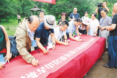 在景迈山古茶林,海外华文媒体代表共同签字留念助力申遗成功。李 凡摄